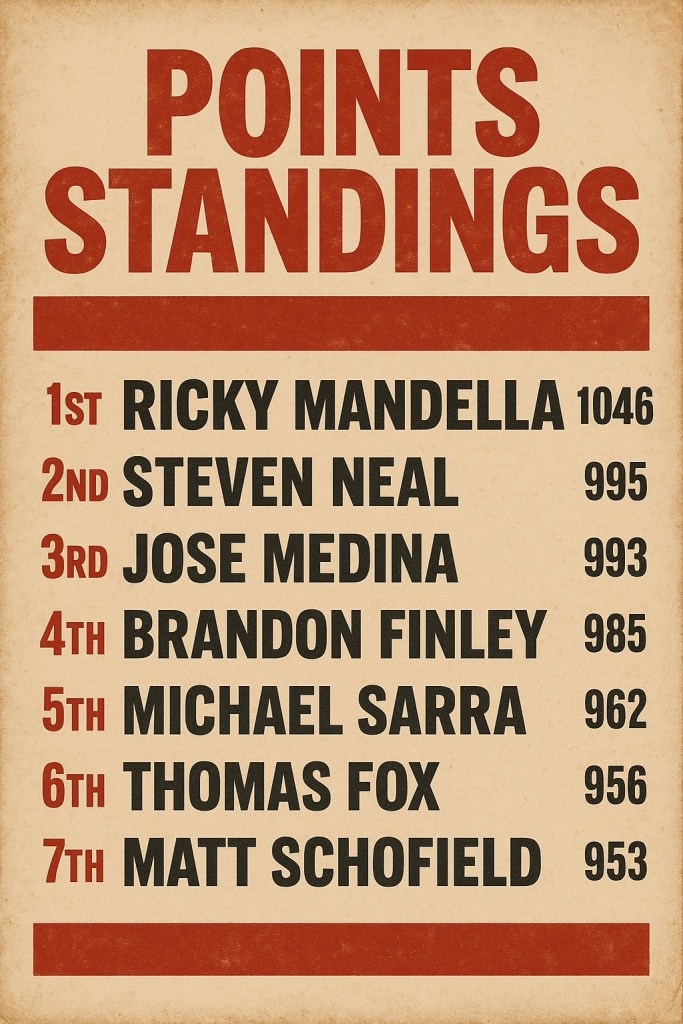 Steven Neal trails Mandella by 51 points and boasts the group’s best average finish (13.3), despite having the worst qualifying average—a critical factor that could drastically improve his championship chances if corrected.